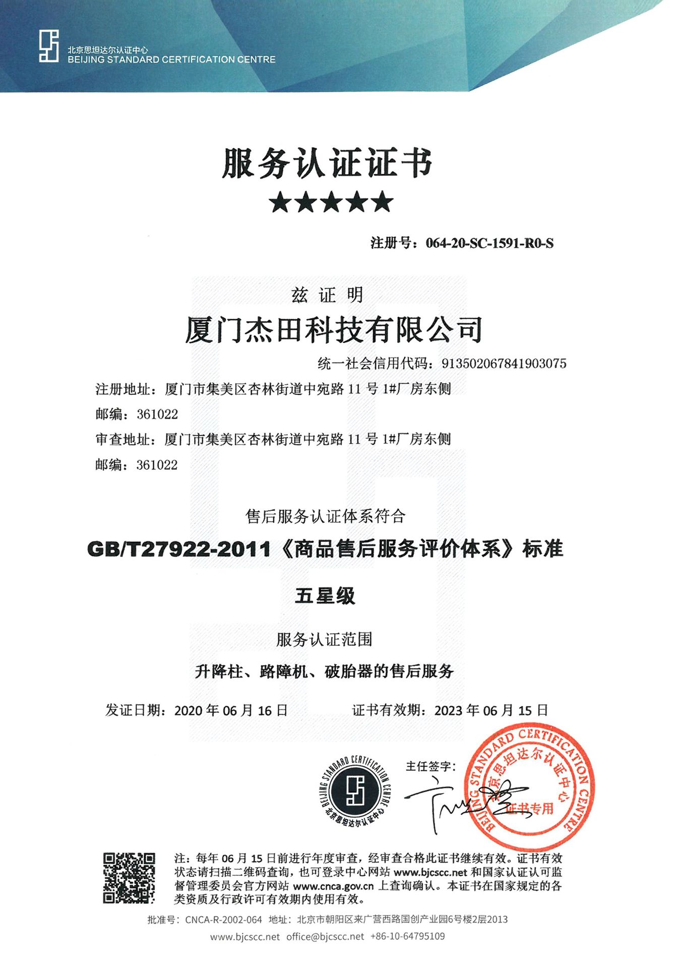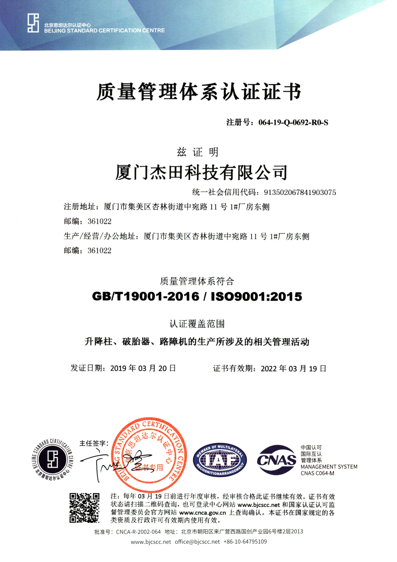 杰田科技是一家集升降柱、路障機(jī)、破胎器等反恐防爆設(shè)施的研發(fā)、設(shè)計(jì)、生產(chǎn)及銷售于一體的綜合型科技現(xiàn)代化企業(yè),現(xiàn)產(chǎn)品已率先通過(guò)GA/T 1343-2016《防爆升降式阻車路障》公安部型式檢驗(yàn)報(bào)告、歐盟CE認(rèn)證、ISO 9001-2015質(zhì)量管理體系認(rèn)證、ISO 14001-2015環(huán)境管理體系認(rèn)證、ISO 45001-2018中國(guó)職業(yè)健康安全管理體系認(rèn)證、GB/T 27922-2011商品售后服務(wù)五星評(píng)價(jià)認(rèn)證、GB/T29490-2013企業(yè)知識(shí)產(chǎn)權(quán)管理體系認(rèn)證等多項(xiàng)國(guó)家權(quán)威質(zhì)量檢測(cè);同時(shí)公司也榮獲“廈門(mén)市高新技術(shù)企業(yè)”和“國(guó)高家新技術(shù)企業(yè)” “廈門(mén)市科技小巨人領(lǐng)軍企業(yè)” 和“福建省科技小巨人領(lǐng)軍企業(yè)”“ 廈門(mén)市守合同重信用企業(yè)” “中國(guó)升降柱十大品牌”等榮譽(yù)稱號(hào)。