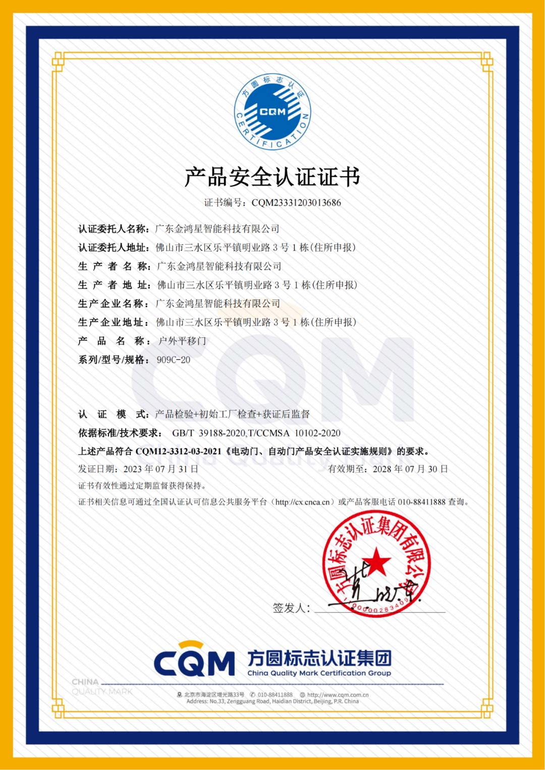 金鴻星產(chǎn)品經(jīng)過一系列嚴格的審查及評審,順利獲得戶外平移門以及電動伸縮門“產(chǎn)品安全認證”證書,不僅彰顯了金鴻星在行業(yè)內(nèi)的地位,更證實了金鴻星在產(chǎn)品安全上不斷精進的實踐與成果。金鴻星始終以產(chǎn)品安全與智能的發(fā)展為前提,不斷對產(chǎn)品的性能進行持續(xù)升級,致力于研發(fā)高品質(zhì)、安全與智能的放心產(chǎn)品,引領(lǐng)行業(yè)高質(zhì)量高標準健康發(fā)展,給每一位選擇金鴻星的客戶都能買的放心,用的安心。