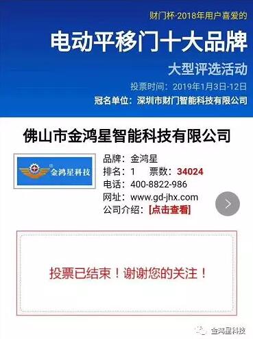 齊心協(xié)力,開拓創(chuàng)新。自“金鴻星杯·2018第八屆用戶喜愛的中國伸縮門十大品牌”大型評選活動開啟以來,金鴻星智能科技有限公司就受到業(yè)內(nèi)外人士的廣泛支持, 并再次蟬聯(lián)全國伸縮門網(wǎng)十大品牌評選前三甲,收獲“伸縮門十大品牌”排名第二、“電動平移門十大品牌”排名第一,金鴻星旗下家運來“庭院別墅門十大品牌“排名第一的多項榮譽,在此感謝金鴻星家人辛勤付出,感謝各界人士對金鴻星及家運來的支持與厚愛,榮耀只是過去,未來更加可期!