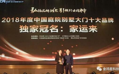 金鴻星品牌獨家冠名中出網(wǎng)&中國伸縮門網(wǎng)2018年度“中國伸縮門十大品牌”、金鴻星旗下高端品牌“家運來”獨家冠名中出網(wǎng)&中國伸縮門網(wǎng)”庭院別墅大門”品牌。