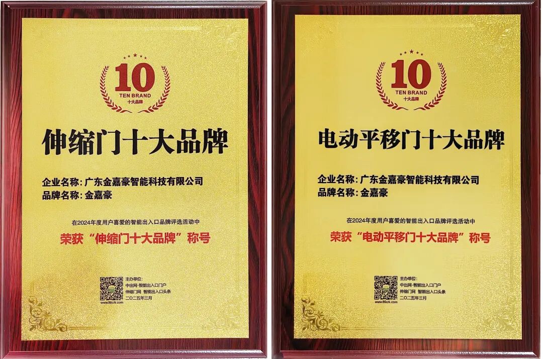 2025年3月14日,廣東金嘉豪智能科技有限公司再次迎來高光時刻!憑借卓越的產(chǎn)品力與行業(yè)口碑,公司一舉榮獲由中出網(wǎng)評審的“2024年度伸縮門十大品牌”及“2024年度電動平移門十大品牌”雙項榮譽!這一榮譽不僅是對金嘉豪技術(shù)實力的高度認可,更是對企業(yè)深耕智能門控領(lǐng)域的里程碑式發(fā)展發(fā)展的充分肯定。