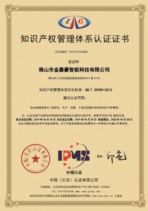近日,佛山市金嘉豪智能科技有限公司榮獲中規(guī)(北京)認(rèn)證有限公司頒發(fā)的“知識(shí)產(chǎn)權(quán)管理體系認(rèn)證證書”,證書編號(hào):18119IP2224R0S,認(rèn)證范圍:電動(dòng)伸縮門圍墻大門的研發(fā)、生產(chǎn)、銷售、上述過程相關(guān)采購的知識(shí)產(chǎn)權(quán)管理。