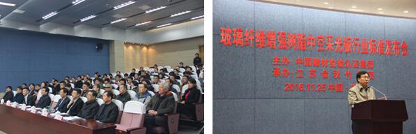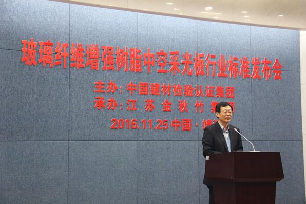 2016年11月25日上午9時(shí),由中國(guó)建材檢驗(yàn)認(rèn)證集團(tuán)和江蘇金秋竹集團(tuán)聯(lián)合主編的“GRP高強(qiáng)中空采光板行業(yè)標(biāo)準(zhǔn)”在市政府3#報(bào)告廳隆重發(fā)布,來(lái)自清華大學(xué)生態(tài)規(guī)劃與綠色建筑設(shè)計(jì)研究所、北京新型材料建筑設(shè)計(jì)研究院、天津市建筑設(shè)計(jì)院以及軍隊(duì)、航空等建筑設(shè)計(jì)單位的50多名專家學(xué)者應(yīng)邀出席,發(fā)布會(huì)由中國(guó)建材檢驗(yàn)認(rèn)證集團(tuán)主任蔣荃主持。