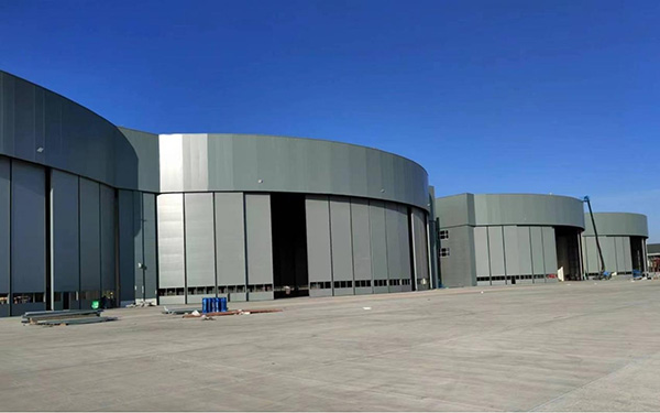 我公司歷時兩年,全新研制出弧形重疊側(cè)轉(zhuǎn)門。該門是側(cè)轉(zhuǎn)機庫門的一種特殊衍生產(chǎn)品,適用于弧形特種機庫,正面為弧形軌道,側(cè)面為直線軌道,二種軌道間自然銜接,門扇運行平滑過渡。弧形門具有更強的抗風(fēng)能力,占用空間小,安裝要求低等優(yōu)點,無需設(shè)置門庫,相鄰機庫門可同時打開,每組門扇作為獨立單元驅(qū)動,可單獨或集中啟閉。當(dāng)大門處于關(guān)閉狀態(tài)時,門體呈弧形布置,與機庫造型完美吻合。