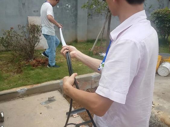 回填砂石,回填至距離地面30cm左右,澆水沉降2小時(shí)候后夯實(shí)。