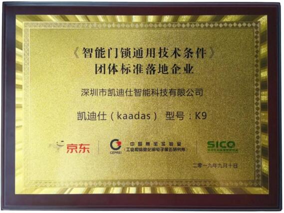 2019年9月10日,由京東零售和深圳品質(zhì)消費研究院主辦,中國五金產(chǎn)業(yè)技術(shù)創(chuàng)新戰(zhàn)略聯(lián)盟和工信部電子第五研究所承辦的京東智能鎖平臺標準升級啟動會在廣州舉行。凱迪仕率先通過該團體標準檢測,榮獲“《智能門鎖通用技術(shù)條件》團體標準落地企業(yè)”證書,成為首批京東智能門鎖“品質(zhì)優(yōu)選”打標品牌。