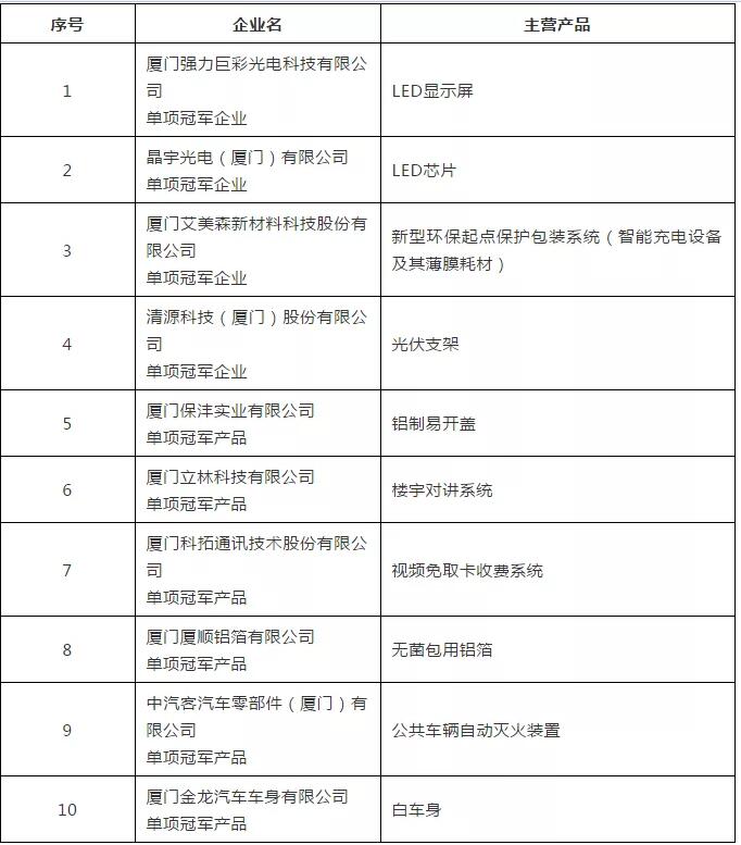 福建省第三批制造業(yè)單項(xiàng)冠軍(產(chǎn)品)一覽表(廈門)