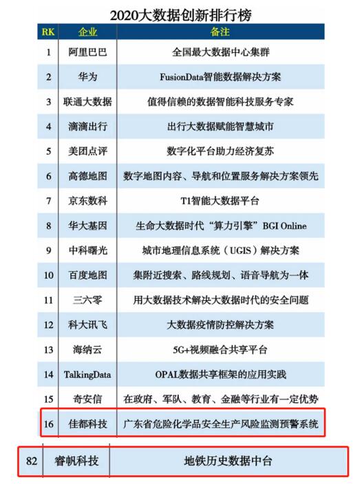 8月20日,中國(guó)科學(xué)院《互聯(lián)網(wǎng)周刊》、eNet研究院、德本咨詢(xún)共同評(píng)選發(fā)布了“2020大數(shù)據(jù)創(chuàng)新排行榜”,佳都科技“廣東省危險(xiǎn)化學(xué)品安全生產(chǎn)風(fēng)險(xiǎn)監(jiān)測(cè)預(yù)警系統(tǒng)”以及參股公司睿帆科技“地鐵歷史數(shù)據(jù)中臺(tái)”均入選榜單。