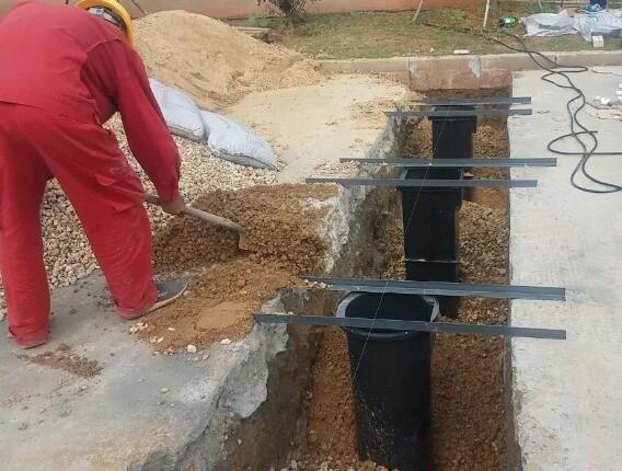 回填砂石,回填至距離地面30cm左右,澆水沉降2小時候后夯實。