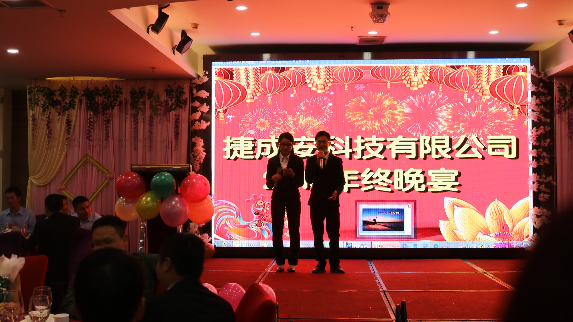 18點30分,晚會在兩位主持人的祝福聲中開始,即時,大家歡聲笑語中,祝福捷成安越來越好。