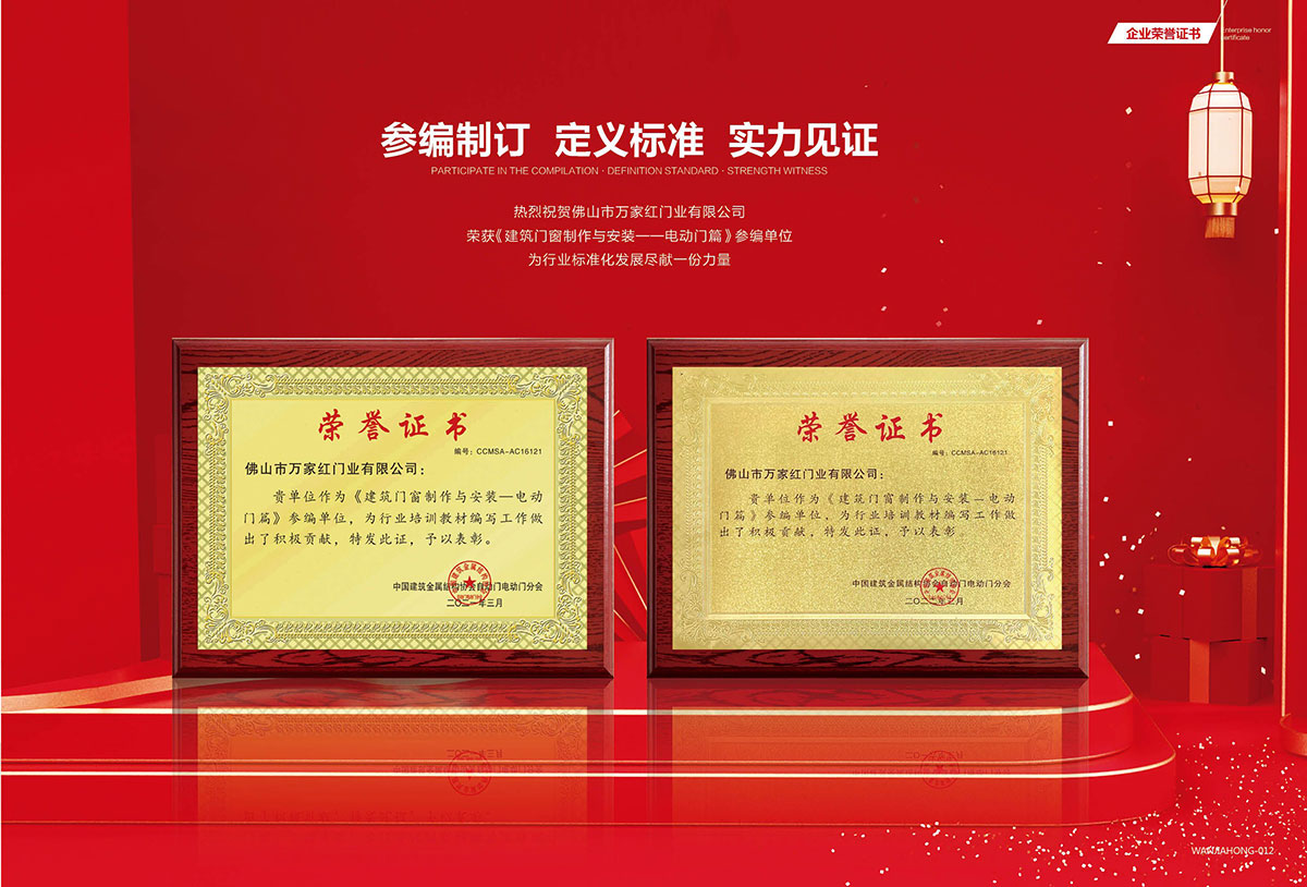 熱烈祝賀佛山市萬家紅門業(yè)有限公司榮獲《建筑門窗制作與安裝--電動門篇》參編單位,為行業(yè)標(biāo)準(zhǔn)化發(fā)展盡獻一份力量。