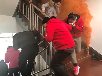 煙霧四起,各部門主管協(xié)助各樓層負責人引導員工開始向疏散走道、安全出口部位有序疏散。