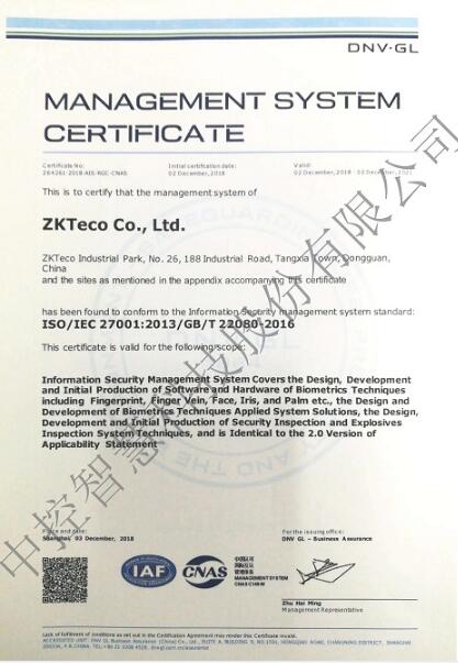 東莞中控智慧建立并實(shí)施的信息安全管理體系順利通過DET NORSKE VERITAS 挪威船級社的認(rèn)證審核,取得了信息安全管理體系認(rèn)證證書。