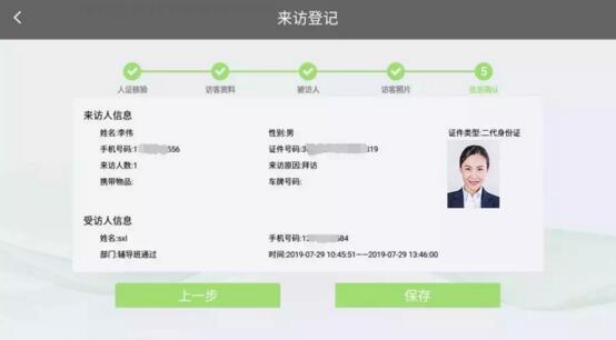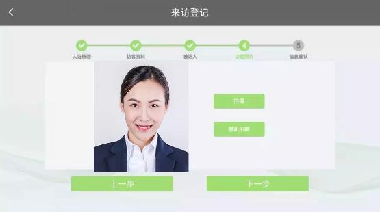 登記流程:人證核驗(yàn)/手動登記——完善訪客信息——選擇被訪人、填入來訪時間——錄入人臉——信息確認(rèn),打印憑條。