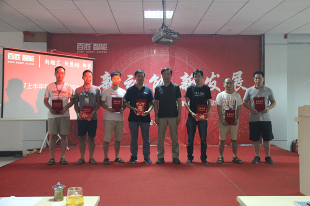 會(huì)議對(duì)上半年完結(jié)并成功上市的優(yōu)秀項(xiàng)目負(fù)責(zé)人進(jìn)行了公開表彰。劉董親自向”36V直流無刷伸縮門機(jī)、超級(jí)道閘門、人行通道廣告門“三個(gè)項(xiàng)目主要負(fù)責(zé)人頒發(fā)榮譽(yù)證書及獎(jiǎng)金。